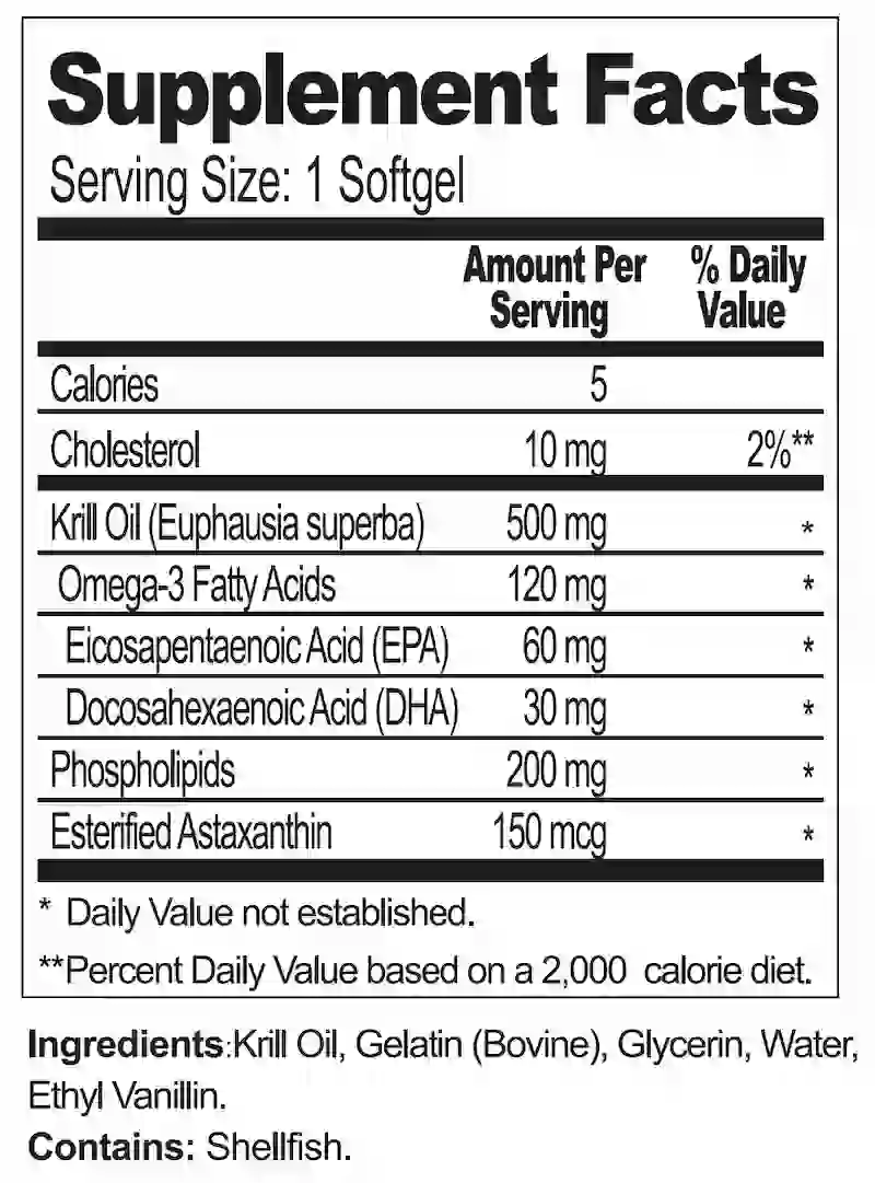 - Supports Cardiovascular Function: Krill oil is rich in Omega-3 fatty acids, including EPA and DHA, which are known to maintain healthy cholesterol levels and support overall heart health by reducing inflammation.